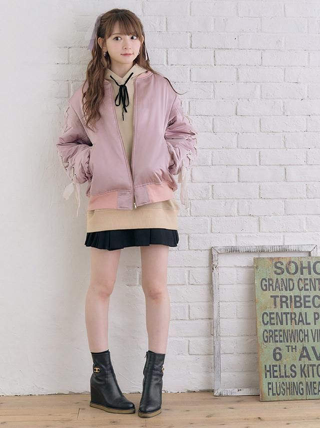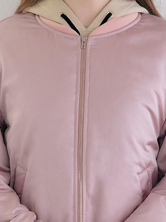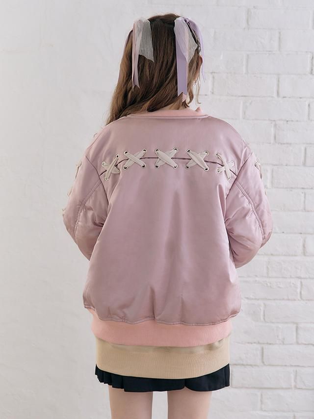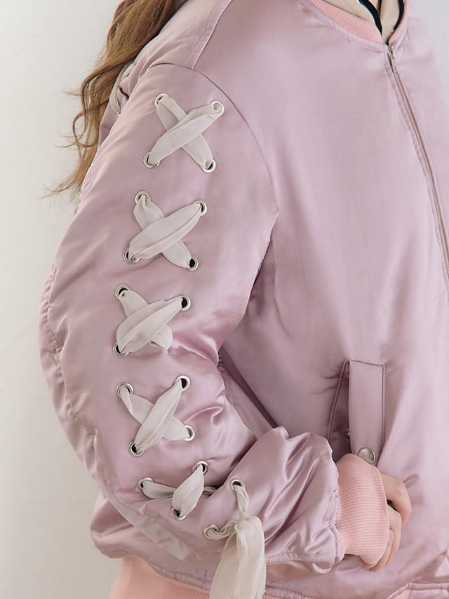 くすみピンクの綺麗な光沢が大人可愛いブルゾン。ゆったりとしたオーバーサイズで、中綿も入っているため暖かさはもちろんのこと、程よいボリューム感もプラスして幅広いスタイリングに活躍する万能アウターです。バックスタイルから袖にかけてシフォンレースアップがポイント。